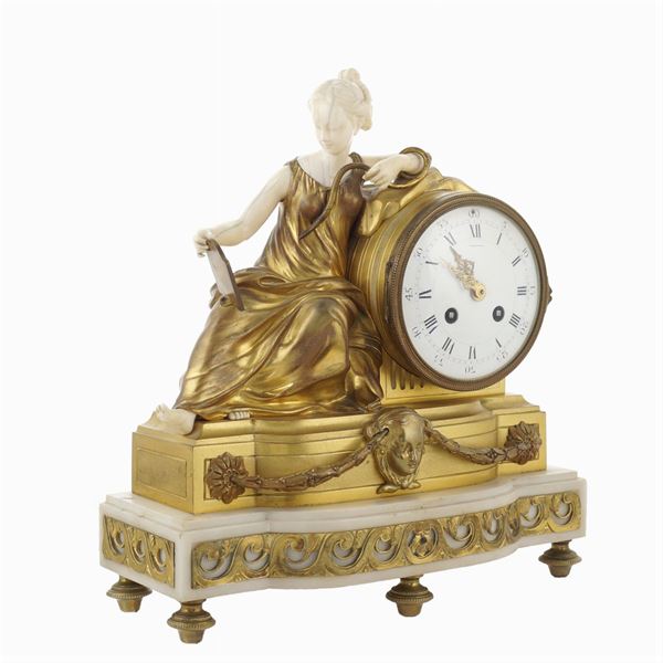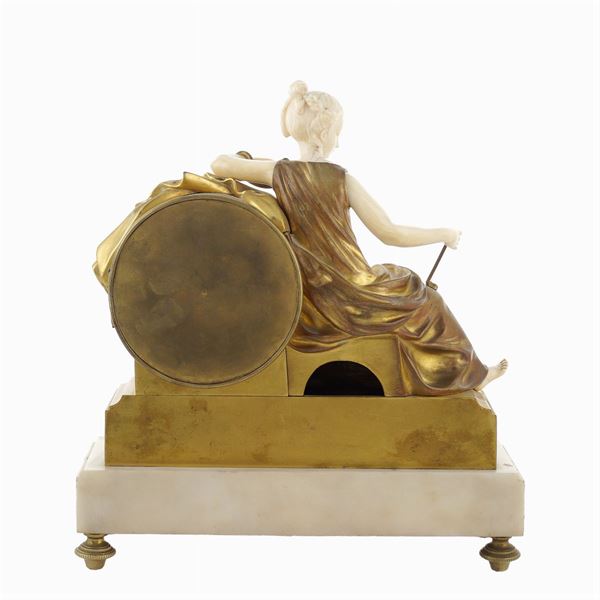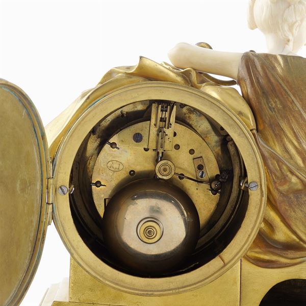 base sagomata in marmo bianco decorata con applicazioni e festoni in bronzo dorato poggiante su quattro piedini circolari, quadrante circolare in smalto bianco con numeri romani per le ore e numeri arabi per i minuti firmato Webb C. Ball, affiancato da una figura femminile seduta realizzata in avorio e bronzo raffigurante Cleopatra e il serpente, revisionata e funzionante. Provenienza: collezione privata romana.