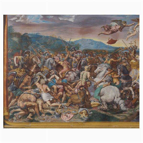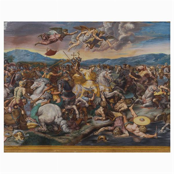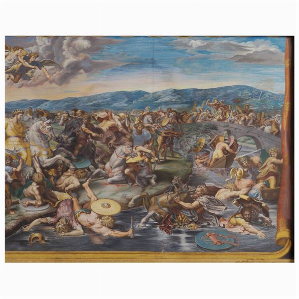 "La battaglia tra Costantino e Massenzio a Ponte Milvio", acquaforte in 4 lastre applicata su tela incisa nel 1683, e colorata a tempera, in basso a destra reca scritta Fridricus Anders facit 1766, entro cornice in legno dorato non coeva. La leggenda narra che Costantino, accampatosi nella piana di Saxa-Rubra, vide in sogno un angelo con una croce con le parole "In Hoc Signo Vinces" (vincerai sotto questo simbolo), indica la completa conversione al Cristianesimo dell'Imperatore e del Popolo Romano. Pubblicata da G. De Rossi in Roma