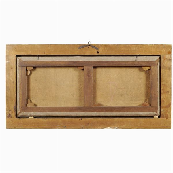 "Mare in tempesta con velieri", olio su tela, entro cornice in legno dorato, 31x73 cm.