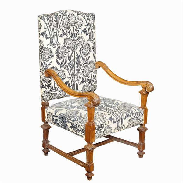 intagliata con motivi vegetali, sedute e schienali imbottiti e rivestiti in tessuto, 120x57x61 cm.