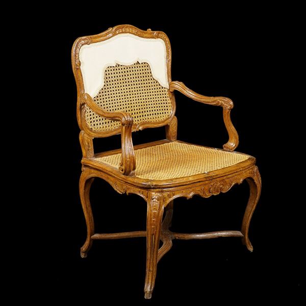 intagliato con motivi vegetali a volute, seduta e schienale in paglia di Vienna, lievi difetti, 98x64x51 cm.