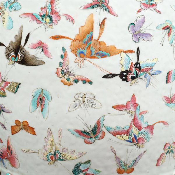 decorato in policromia con motivi di farfalle su fondo bianco, 50x32 cm.