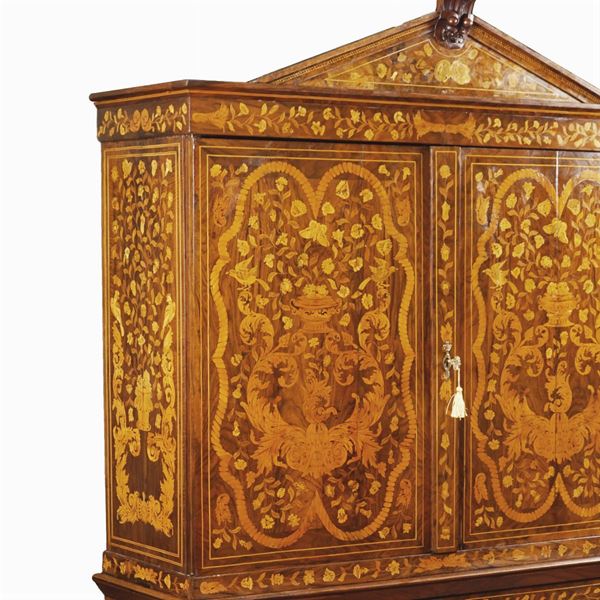 intarsiato in legni di frutto con motivi floreali, vegetali e di volute, parte superiore a due sportelli con all'interno un ripiano e tiretti vari, parte inferiore con un cassetto centrale poggiante su quattro sostegni ed una crociera lavorati a torchon, lievi difetti., 225x151x53 cm.