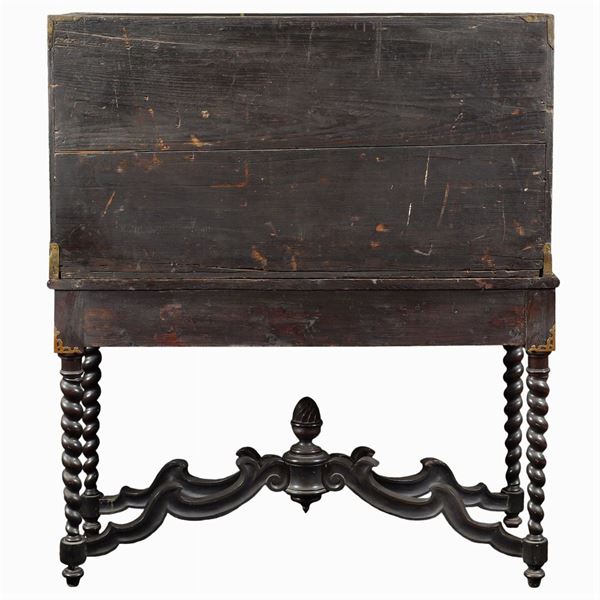 parte superiore con fronte a 11 cassetti e fianchi provvisti di due maniglie in bronzo, parte inferiore con fascia a due cassetti poggiante su quattro sostegni a torchon riuniti al centro da crociera in legno intagliato, fregi e pomi in bronzo, lievi difetti e mancanze, 142x123x47 cm.