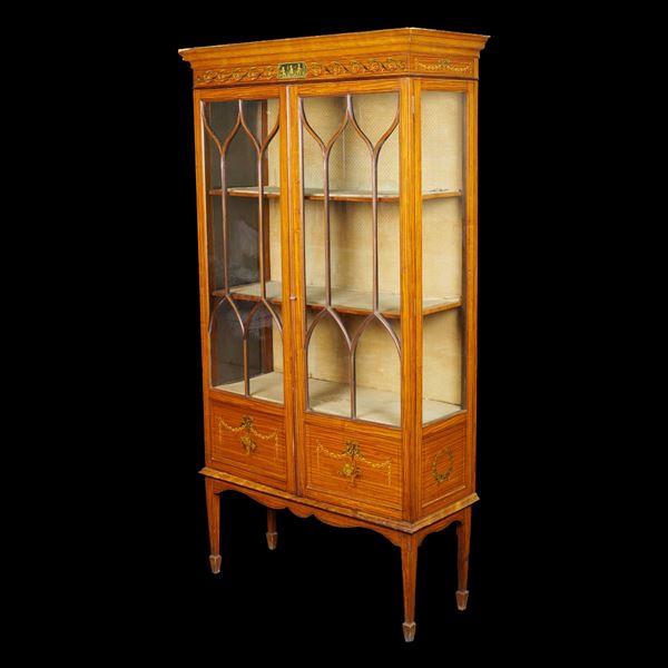 dipinto con motivi neoclassici in policromia, fronte a due sportelli, interno con ripiani e rivestimento in tessuto, gambe troncopiramidali, difetti e mancanze, 187x92x38 cm.