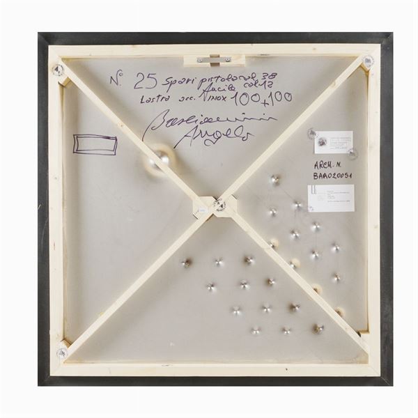"25 spari pistola calibro 38 e fucile calibro 12", spari su lamiera acciaio inox, 2016. Opera archiviata con il                    n° BAA020051, 100x100 cm.