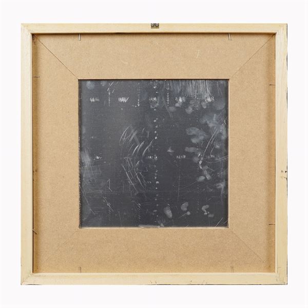 "Dessin de feu sur aluminium", fiammiferi bruciati su lastra di alluminio, 2009, firmata in basso a sinistra. Opera archiviata con il n° DFA 12900000902015, 30x30 cm.