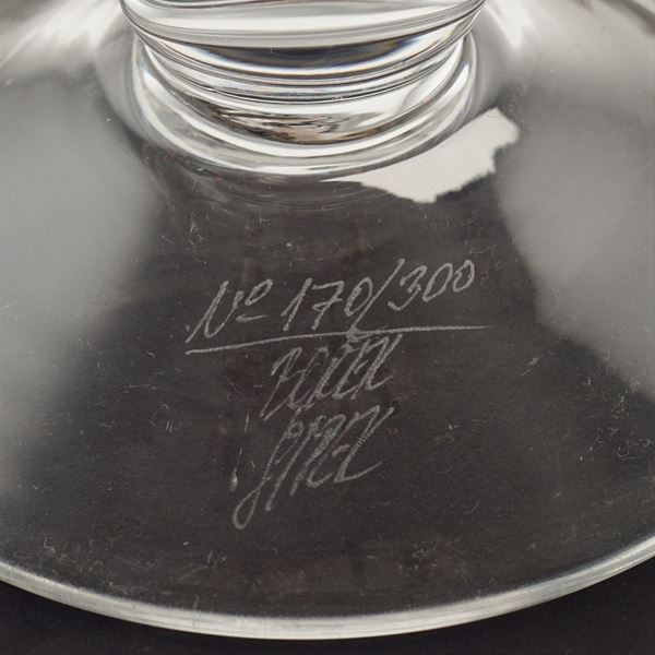 candeliere portafiori "Machytka" in vetro soffiato e ottone dorato, poggiante su base circolare, firmato e numerato es. 170/300, h. 43 cm.