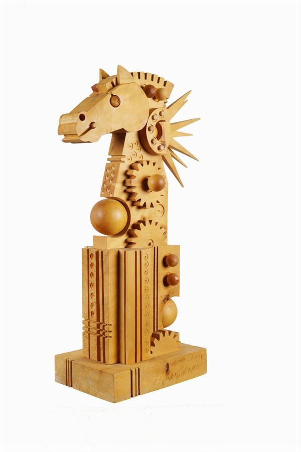 "Cavallo", scultura in legno, 2003, firmata e datata sul retro, 80x33x24 cm.