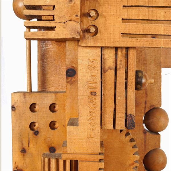 "Senza titolo", grande scultura in legno poggiante su base squadrata, firmata e datata '83, 220x40x40