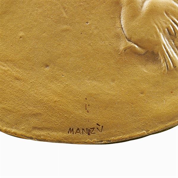 "Volo di Colombe", scultura altorilievo in bronzo, firmata al centro, entro cornice, d. 21 cm.