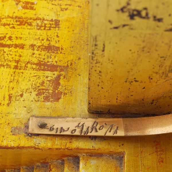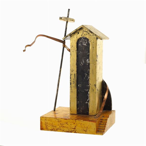 "Senza titolo", scultura in legno e metallo, firmata alla base. Autentica dell'artista su foto, 44x23x19 cm.