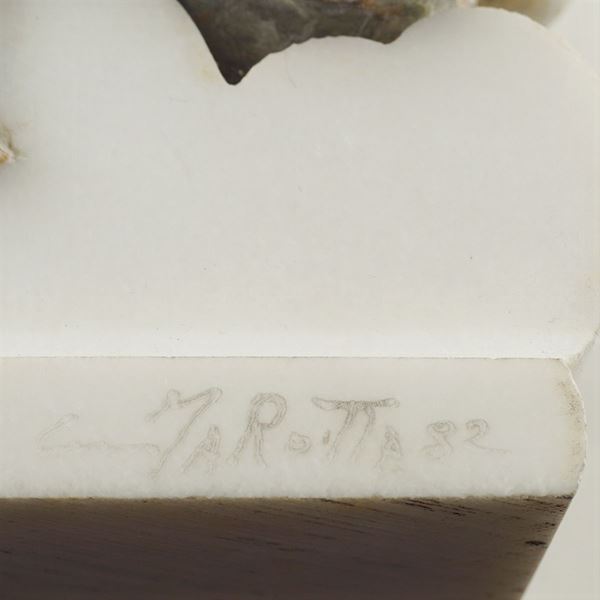 "Quercia barocca", scultura multiplo in marmo, es. XI/XXV, firmata e datata '82 sul retro. Autentica dell'artista su foto, 21,5x17x6 cm.