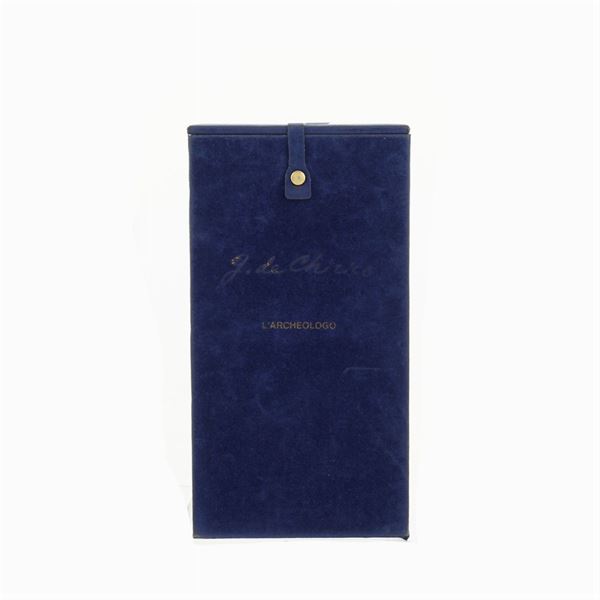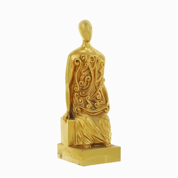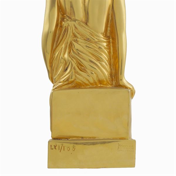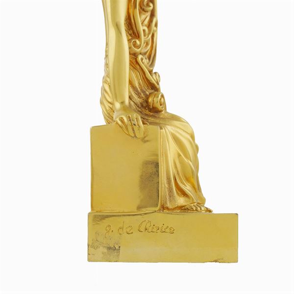 "L'Archeologo", multiplo in bronzo dorato esemplare n. LX1/100, anno 1998, firmata alla base con timbro della Fonderia Bonvicini-Sommacampagna (Verona) entro astuccio originale. Certificato di garanzia della Fondazione Giorgio e Isa De Chirico, 23,5x8x7,5 cm.