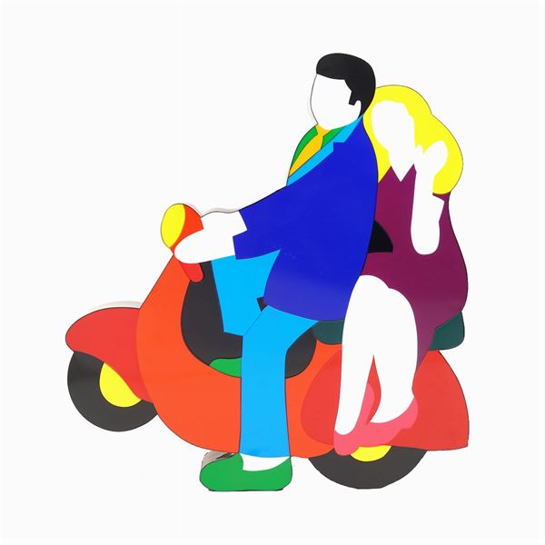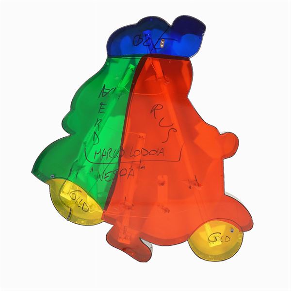 "Vespa", scultura luminosa in pexiglass, titolo e firma sul retro. Autentica dell'artista su foto, 96,5x90x12 cm.