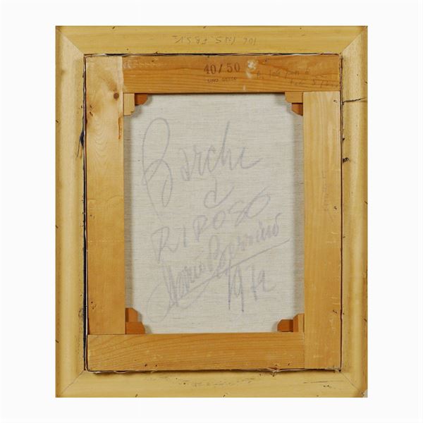 "Barche a riposo", olio su tela, 1972, firmato in basso a destra, titolo, anno e firma sul retro, entro cornice, 50x40 cm.
