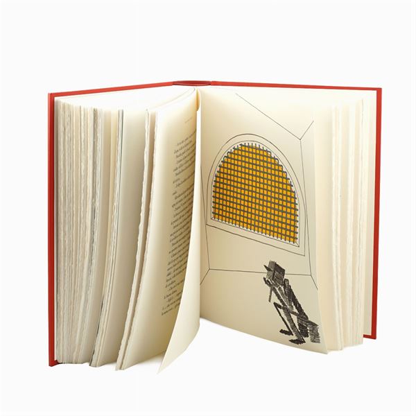 "Pinocchio contro Pinocchio", bassorilievo in pelle es. 84/975, firmato in basso a destra e copertina del volume "Le avventure di Pinocchio"; l'edizione comprende 11 illustrizioni a colori di Mario Ceroli, rilegato in pelle di vitello rossa, edizione FMR Art'è, anno 2002, entro custodia, 46x34x7,5 cm.