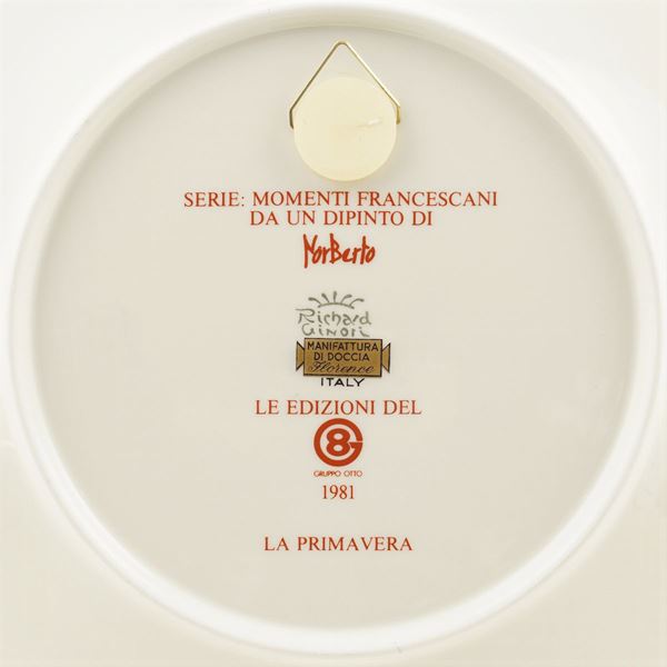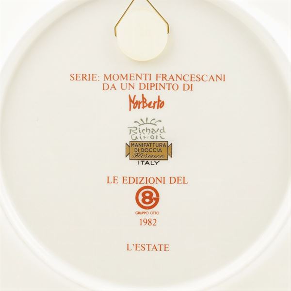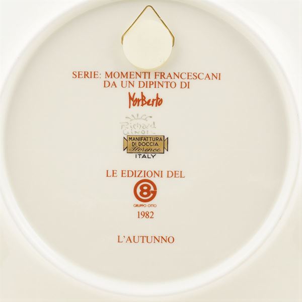 "Monumenti francescani, le quattro stagioni", collezione di quattro piatti da parete in porcellana policroma, firmati sul retro, entro scatole originali, d. 24 cm.