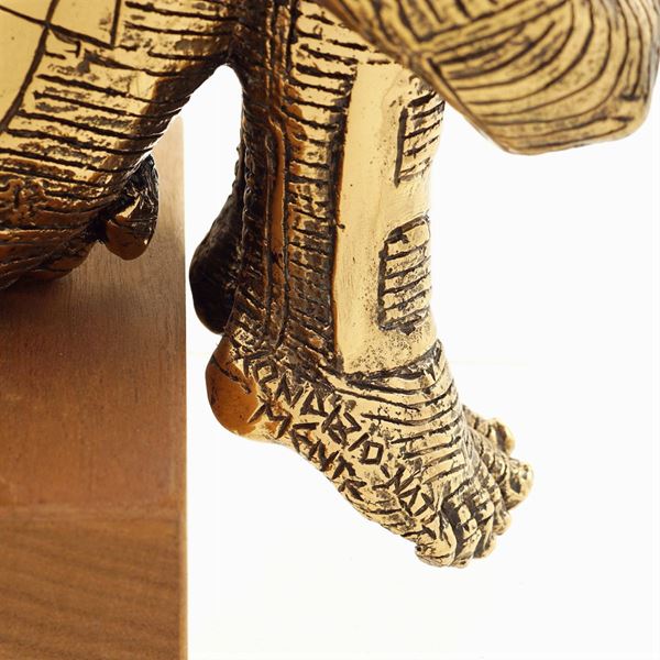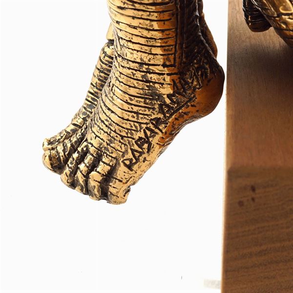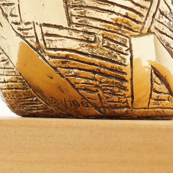 "Condizio-nata-mente", scultura multiplo in bronzo, es. 32/100, firmata, titolo e data su piede, poggiante su base squadrata in legno. Opera archiviata con il n° Rs1302-1700-32, 22,5x15,5x21 cm.