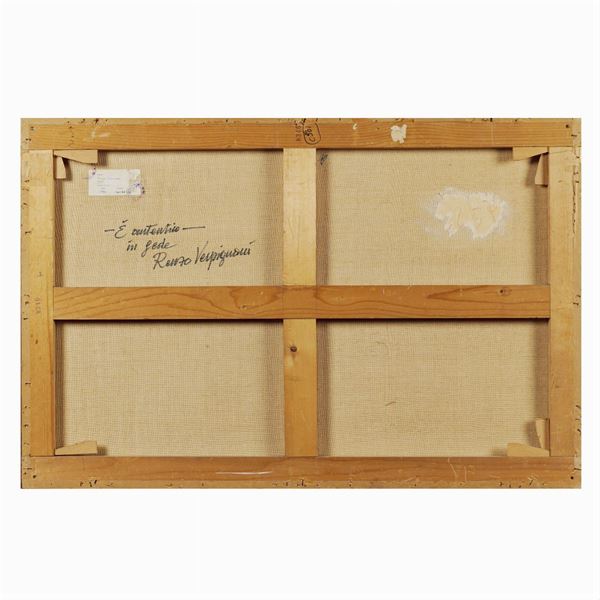 "Periferia", carta applicata su tela, 1964, firmata in basso a destra e per autentica sul retro, entro cornice, 69x104 cm.