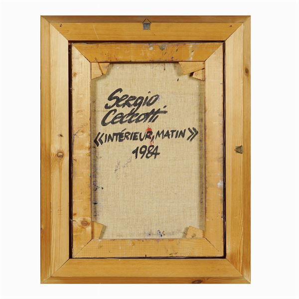 "Intèrieur, matin", olio su tela, 1984, firmato e datato a destra, titolo e firma sul retro, entro cornice, 50x35 cm.