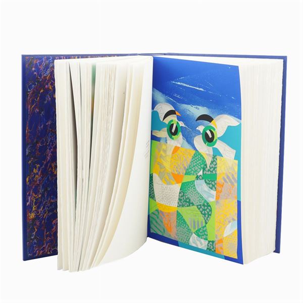 "Lo strappacuori", multiplo in ottone e smalto policromo, es. 572/975, firmata in basso a destra ed applicata su volume "Cantico dei Cantici"; l'edizione comprende otto tavole a colori di Ugo Nespolo, rilegato in pelle di vitello blu, edizione FMR Art'è, anno 2006, entro custodia in plexiglass, 40x18,5x7,5 cm.