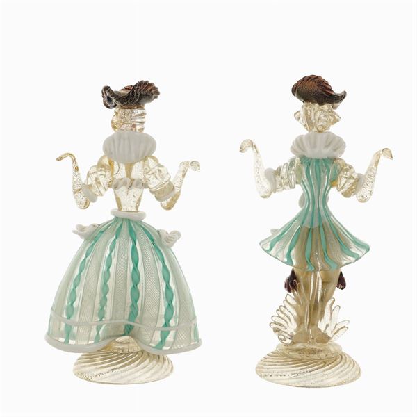 raffigurante una coppia di personaggi in costume settecentesco, poggianti su base circolare, h. 21 - 22 cm.