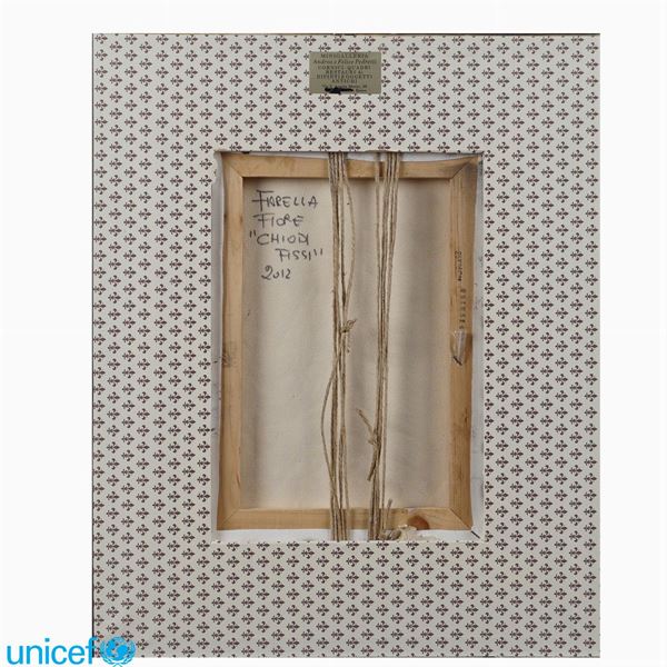 "Chiodi fissi", 2014, istallazione su tela, firmata in basso a destra, entro cornice, 35x25 cm.