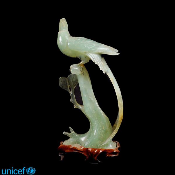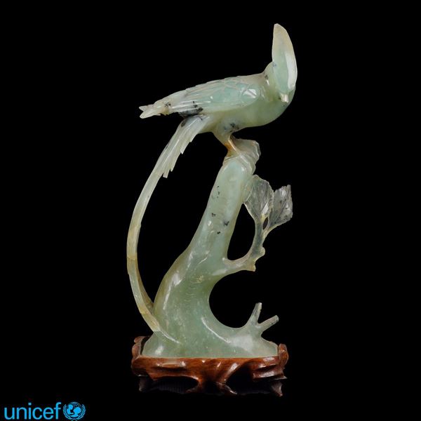 raffigurante un volatle su un ramo, poggiante su base in legno, difetti e rotture, h. 20 cm.