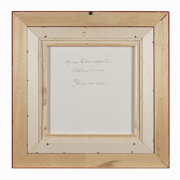 "Vaso con uva", olio su tela, firmato in basso a destra, firma e titolo al retro, entro cornice Autentica su foto dell'artista, 45x45 cm.