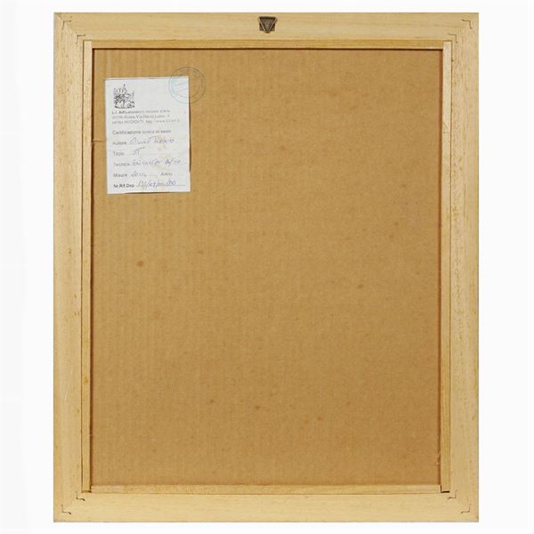 "Senza titolo", litografia a colori es. 86/150, firma in basso a destra, timbro a secco in basso a sinistra, entro cornice, 21x14 cm.
