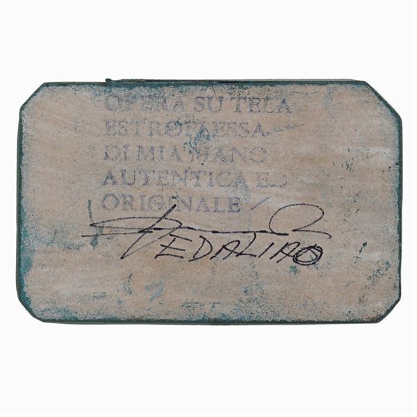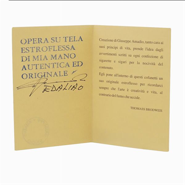 "Dedaliao", tela estroflessa verde, firma al retro, in scatola di latta rossa, certificato dell'artista per autentica, 7.7x13 cm.