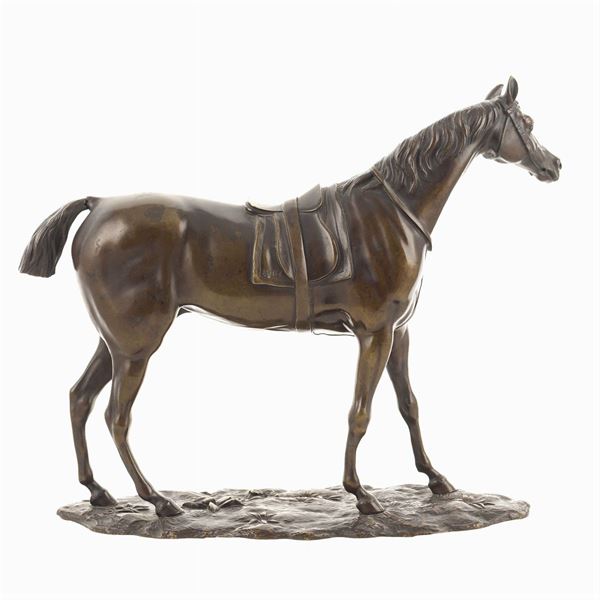raffigurante un cavallo sellato, numerato sulla sella '1061', 24x26.5x9 cm.