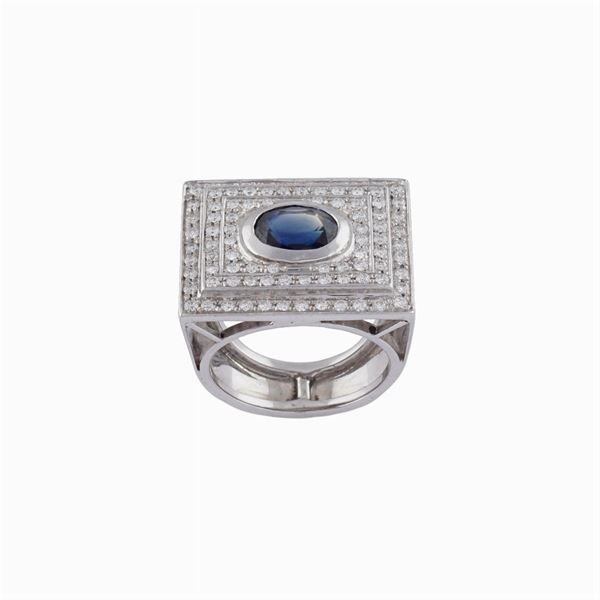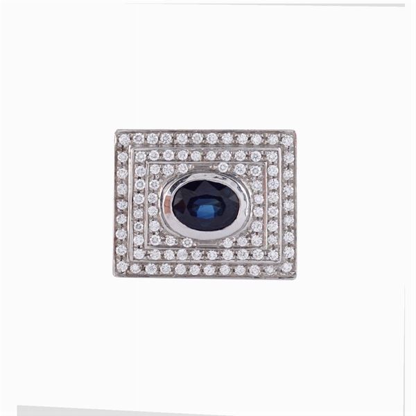 taglio ovale briolet ct 1,80 circa contornato da diamanti taglio brillante ct 1 circa, misura 15, peso 15 gr.