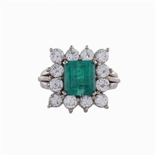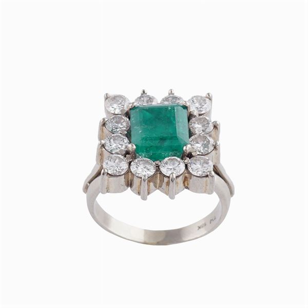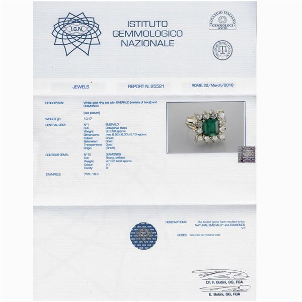 origine Brasile, taglio ottagonale ct 2,50 circa contornato da diamanti taglio brillante ct 1,95 circa, colore I/J - purezza SI, misura 17. Completo di certificato gemmologico I.G.N. n. 25521, peso 10 gr.