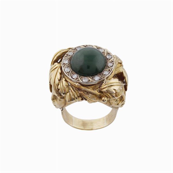 a motivo di foglie con al centro giada taglio cabochon contornata da diamanti taglio brillante per ct 0,40 circa, misura 16, peso 16,8 gr.