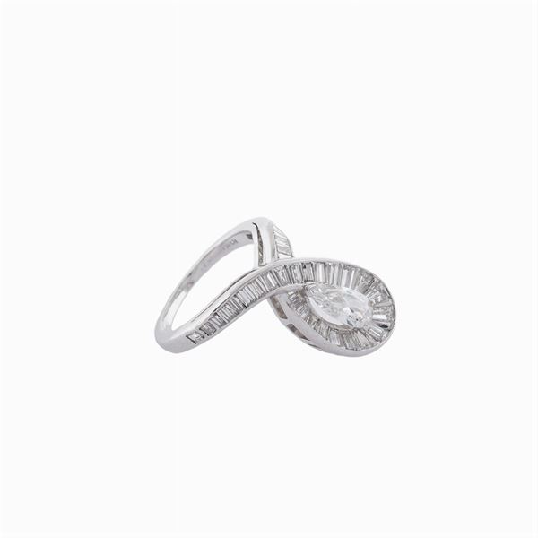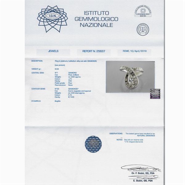 ct 0,60 circa colore J/K - purezza VVS contornato da diamanti taglio baguettes e tapered ct 2,60 circa colore F/G - purezza IF/VVS, misura 9. Completo di certificato gemmologico I.G.N. n. 25637, peso 8 gr.