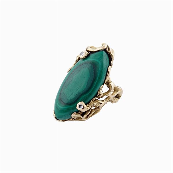 malachite taglio marquise e due diamanti taglio brillante, misura 14, lievi difetti, peso 18,9 gr.