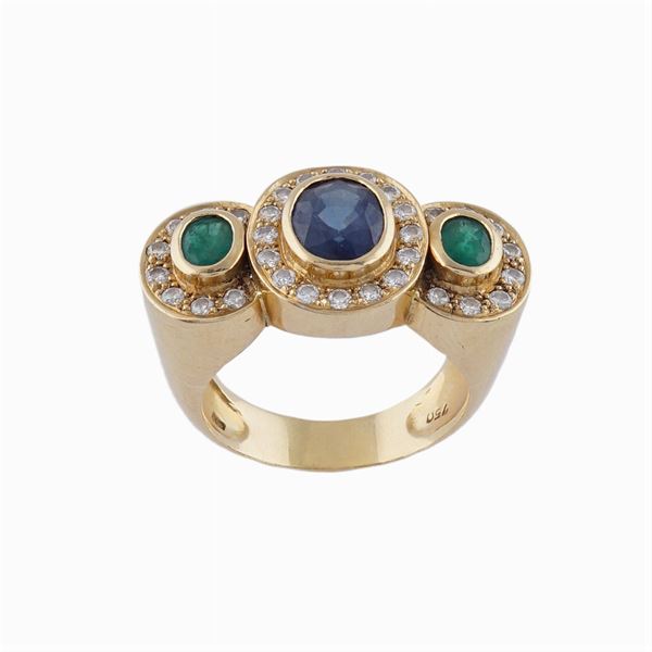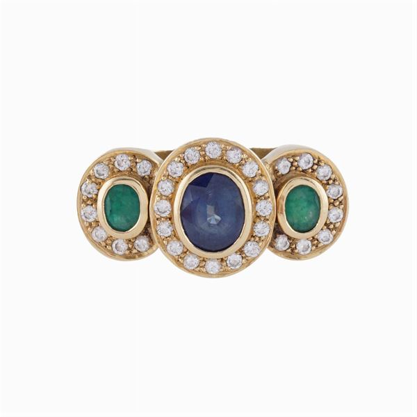 zaffiro taglio ovale briolet ct 2 circa, due smeraldi taglio ovale ct 1 circa e diamanti taglio brillante ct 0,60 circa, misura 21,5, peso 14 gr.