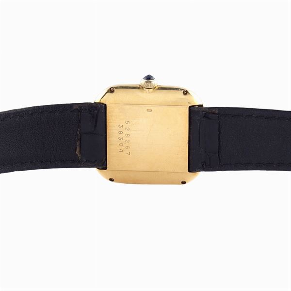 in oro giallo 18kt cassa rettangolare 28x26 mm. quadrante dorato con numeri romani, vetro zaffiro, lievi difetti, movimento meccanico a carica manuale, ref. n. 528267 - 38304, cinturino in pelle con fibbia in metallo