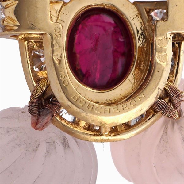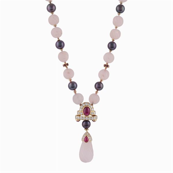 con sfere in quarzo rosa intagliato alternate da piccole maglie in oro giallo e perle Tahiti di 8 mm. circa, pendente centrale in oro giallo, con quarzo rosa a goccia, sormontato da rubini taglio cabochon ct 2,50 circa e diamanti taglio brillante ct 2 circa, chiusura a scomparsa completa di catenina di sicurezza, lunghezza 17 cm., firmato sul retro del centrale, peso 54 gr.