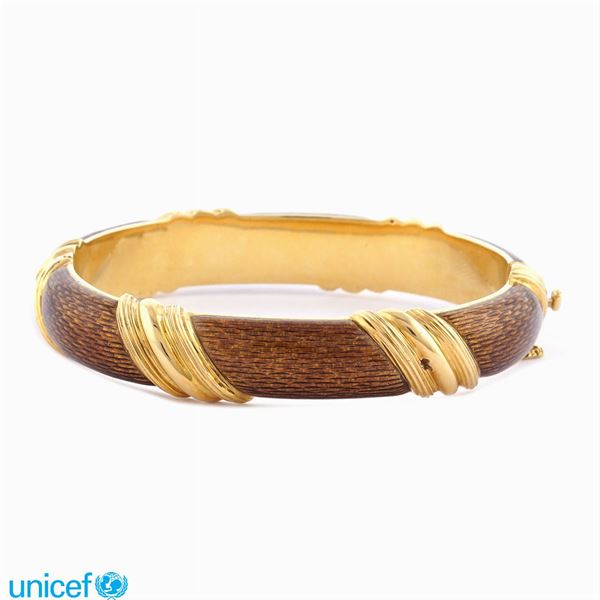 con stesura di smalto guilloché nella tonalità del marrone, alternato ad elementi in oro lavorato a torchon, chiusura a scomparsa completa di catenina di sicurezza, diametro 7cm., peso 57 gr.