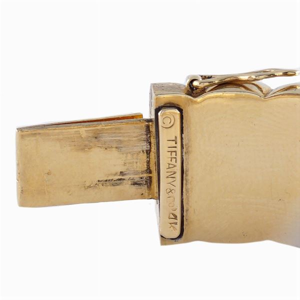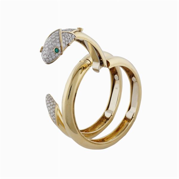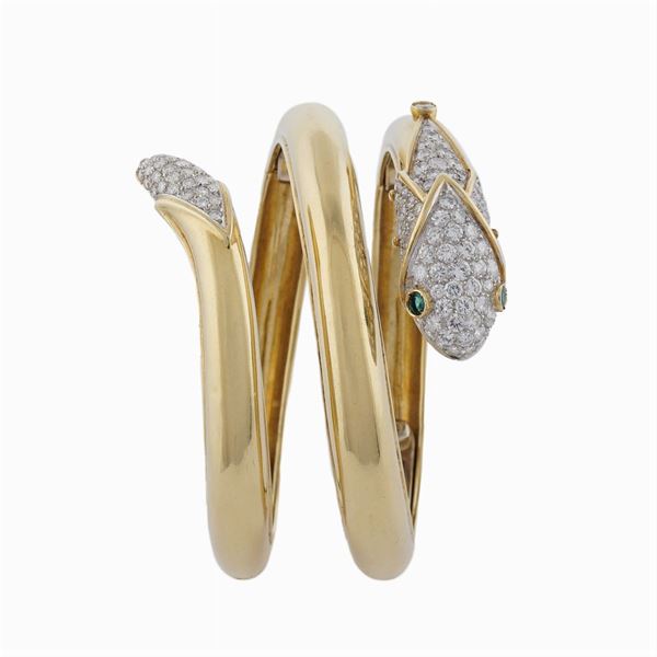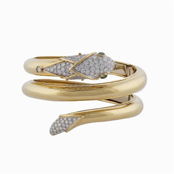 formato da cinque elementi snodabili, testa e coda impreziositi da diamanti taglio brillante ct 4,5 circa e occhi con smeraldi tondi, peso 98 gr.