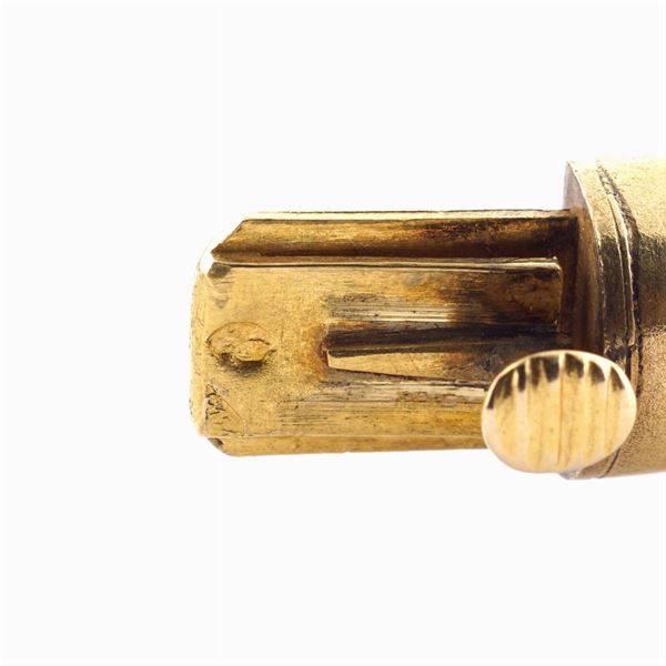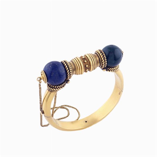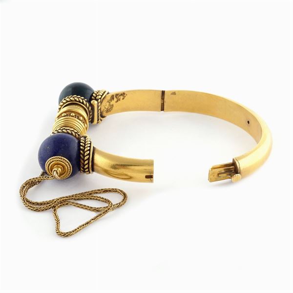 orafo Costantino Palma, bracciale a manetta in oro giallo 18kt, ai lati due sfere in diaspro sanguigno e lapislazzulo all'interno del quale si trova la piccola matita completa di catenina pendente