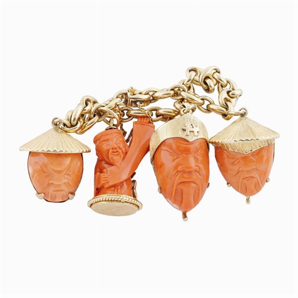 rosso - arancio scolpito e inciso a foggia di figure orientali , bracciale a maglia marinara, lunghezza 19 cm., peso 102 gr.