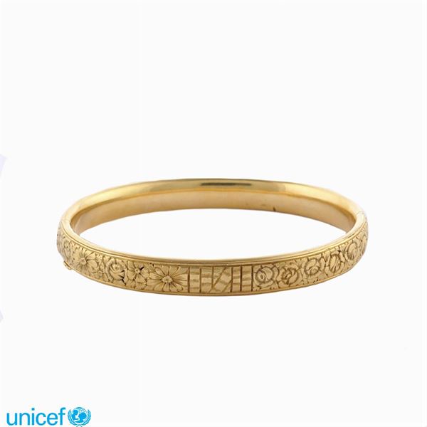 in oro giallo 18kt, inciso e sbalzato a motivo floreale, chiusura a scomparsa, diametro 7 cm., peso 15 gr.