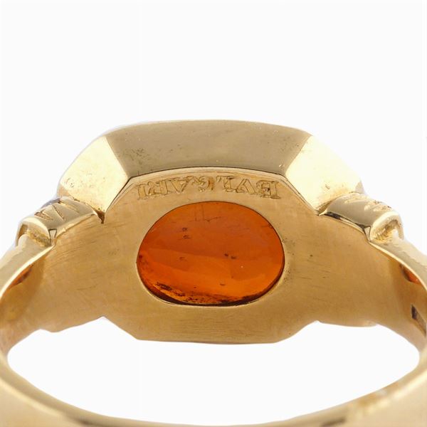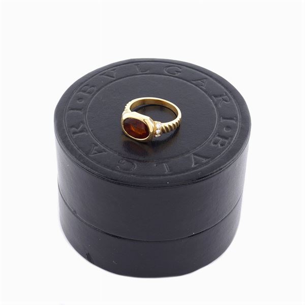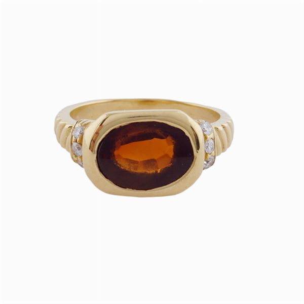 granato taglio ovale e ai lati sei diamanti taglio brillante, firmato all'interno del gambo, misura 10, completo di scatola originale, peso 3 gr.
