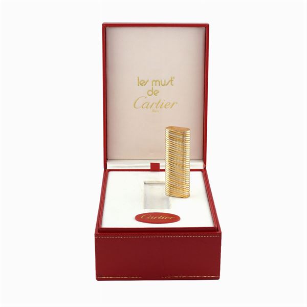 interamente rivestito in oro a tre colori 18kt superficie a righe oblique, completo di scatola originale, altezza 7 cm., peso lordo 97,1 gr.