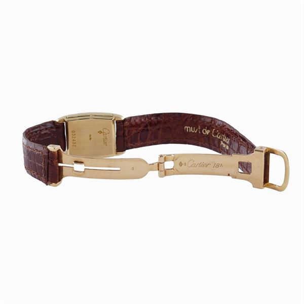 in oro giallo 18kt, cassa basculante 27x19 mm. , ref. n. 032432, quadrante bianco con numeri romani, movimento meccanico a carica manuale, cinturino originale in pelle con fibbia deployante in oro giallo 18kt, completo di custodia