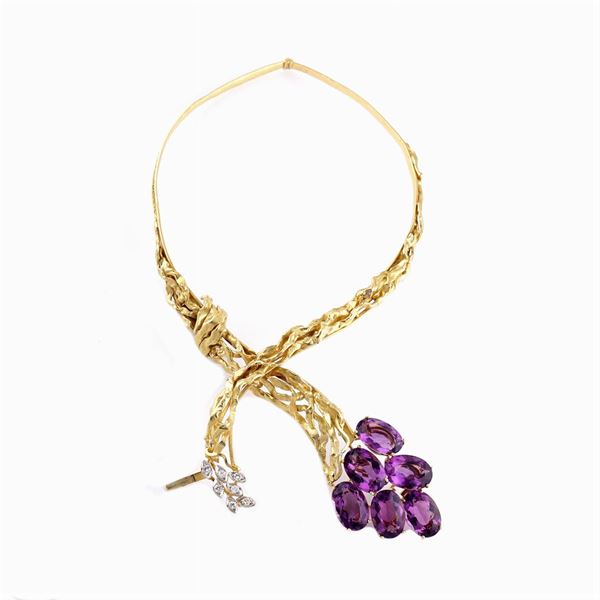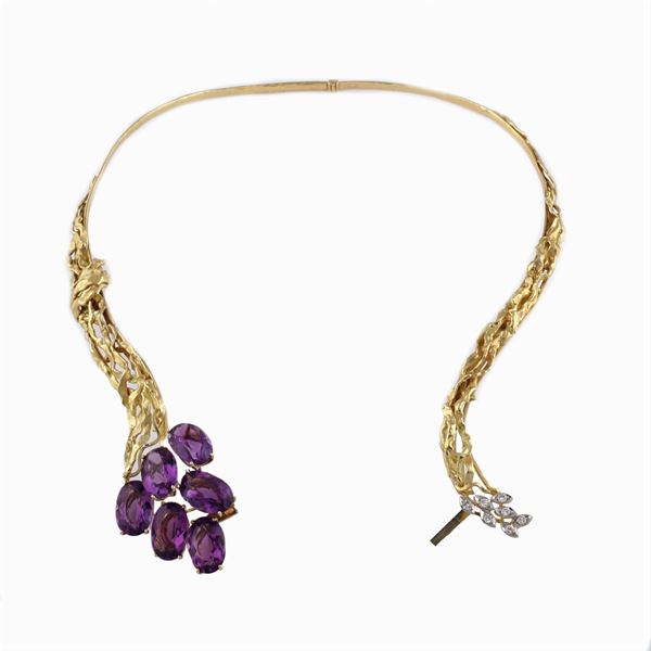 chiusura centrale in oro giallo e sei ametiste taglio ovale briolet con diamanti taglio brillante ct 0,20 circa, peso 85 gr.
